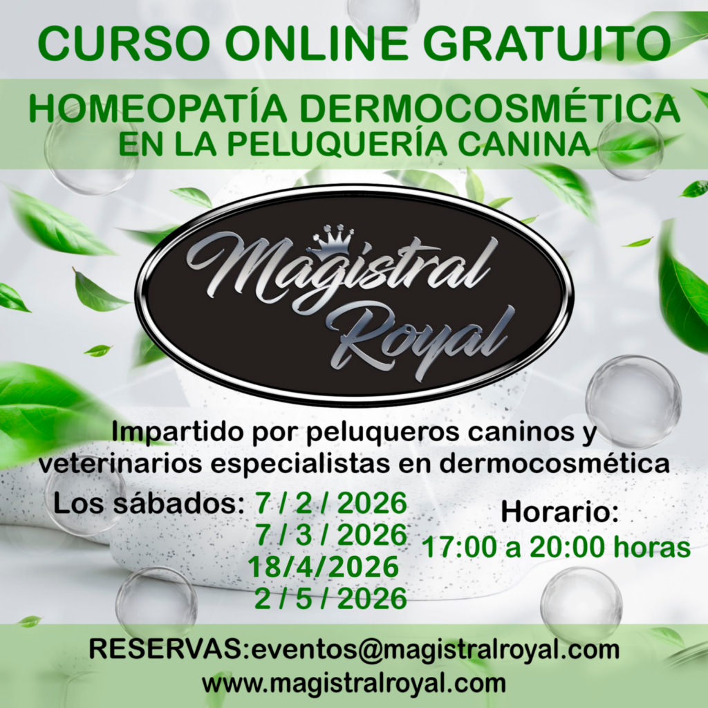 Magistral Royal presenta su próximo curso online gratuito sobre Homeopatía dermocosmética aplicada a los animales de compañía, imprescindible para cualquier peluquero canino, dirigido a todo profesional que sea cliente de Magistral Royal. También queremos profundizar en este curso en los tratamientos de Ozonoterapia realizados con los champús de fitoterapia, sus ventajas y los beneficios de la aromaterapia.